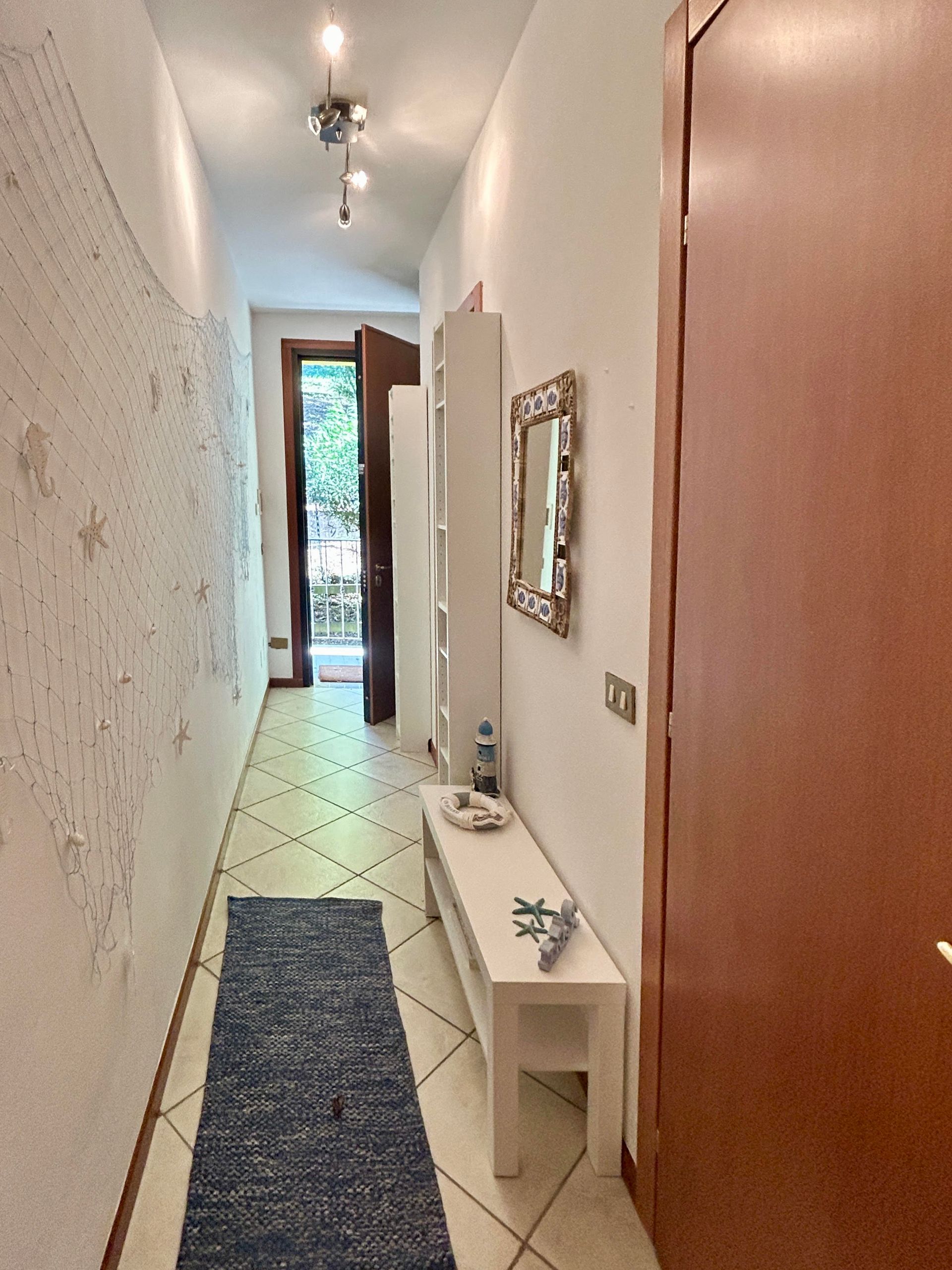L'appartamento di circa 45 mq commerciali, è composto da un accogliente atrio d'ingresso, luminosa zona giorno con cucina a vista e con accesso diretto all'ampio loggiato esclusivo (mq.16), circondato dal verde, che regala scorci sul lago visibili tra la vegetazione.