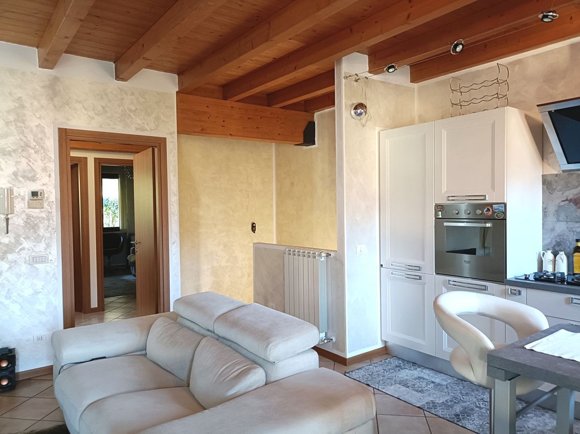In ottima posizione soleggiata e tranquilla, servita da strada chiusa, con vista panoramica, recente Villetta a Schiera con ottime finiture tra cui pietra e legno a vista, caminetto e completa di arredi cucine. Mq.70 a piano seminterrato con Garage, Taverna, Bagno/Lavanderia + Mq.70 a piano Primo con Soggiorno Cottura, Bagno, 2 Camere + Balcone e Giardino fronte/retro di Mq.70 e Posto auto €.295.000 cl.F 170 Kwh/mqa